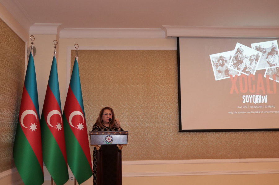 İctimai-Siyasi Sənədlər Arxivinin direktoru Elmira Ələkbərova tədbiri açıq elan edərək bildirib ki, dünya tarixində dinc əhalinin kütləvi soyqırımı kimi dərin iz qoymuş Xatın, Lidise, Sonqmi, Ruanda faciələrilə eyni sırada dayanan Xocalı soyqırımı zamanı vaxtilə 7 min nəfərdən çox əhalinin yaşadığı şəhər bir gecədə yerlə-yeksan edilib, günahsız insanlar məhz azərbaycanlı olduqlarına görə qətlə yetiriliblər. Son iki əsrdə erməni millətçilərinin tarixi Azərbaycan torpaqları hesabına mifik “Böyük Ermənistan” ideyasını gerçəkləşdirmək məqsədilə ardıcıl şəkildə xalqımıza qarşı apardıqları terror, kütləvi qırğın, deportasiya və etnik təmizləmə siyasətindən geniş bəhs edən E.Ələkbərova qeyd edib ki, Xocalı faciəsi bu qeyri-bəşəri siyasətin ən dəhşətli nəticələrindən biridir.