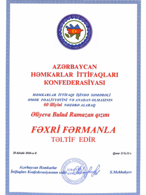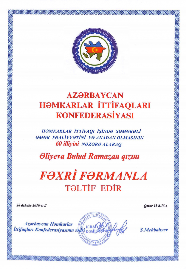 Azərbaycan Respublikası Prezidentinin İşlər İdarəsinin Siyasi sənədlər Arxivinin əməkdaşı Bulud Ramazan qızı Əliyeva Azərbaycan Həmkarlar İttifaqları Konfederasiyası tərəfindən 60 illik yubileyi münasibətilə və həmkarlar ittifaqı işində səmərəli əmək fəaliyyətinə görə Fəxri Fərmanla təltif olunub.